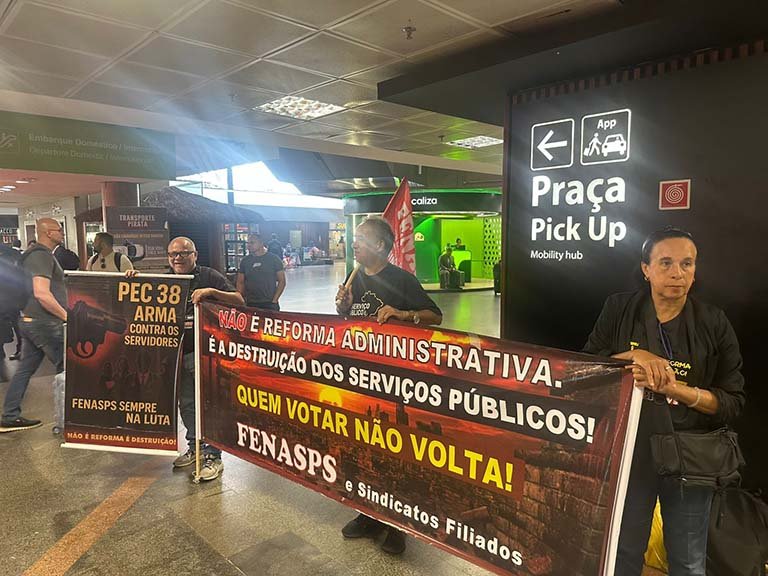 Na continuidade da luta contra reforma administrativa os servidores das três esferas de governo, realizaram hoje 04/11, ato no aeroporto em Brasília. As entidades estão orientando