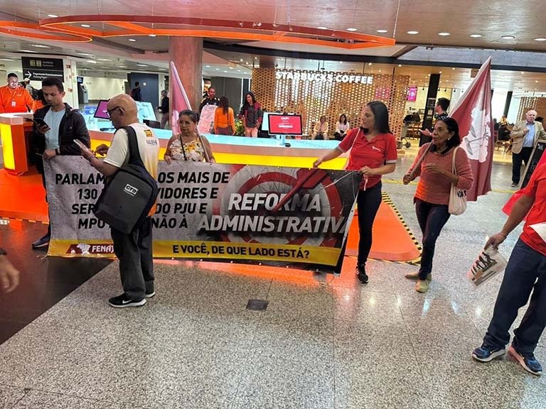 FENASPS e entidades do FONASEFE e centrais sindicais realizam ato no aeroporto de Brasília contra a pec 38