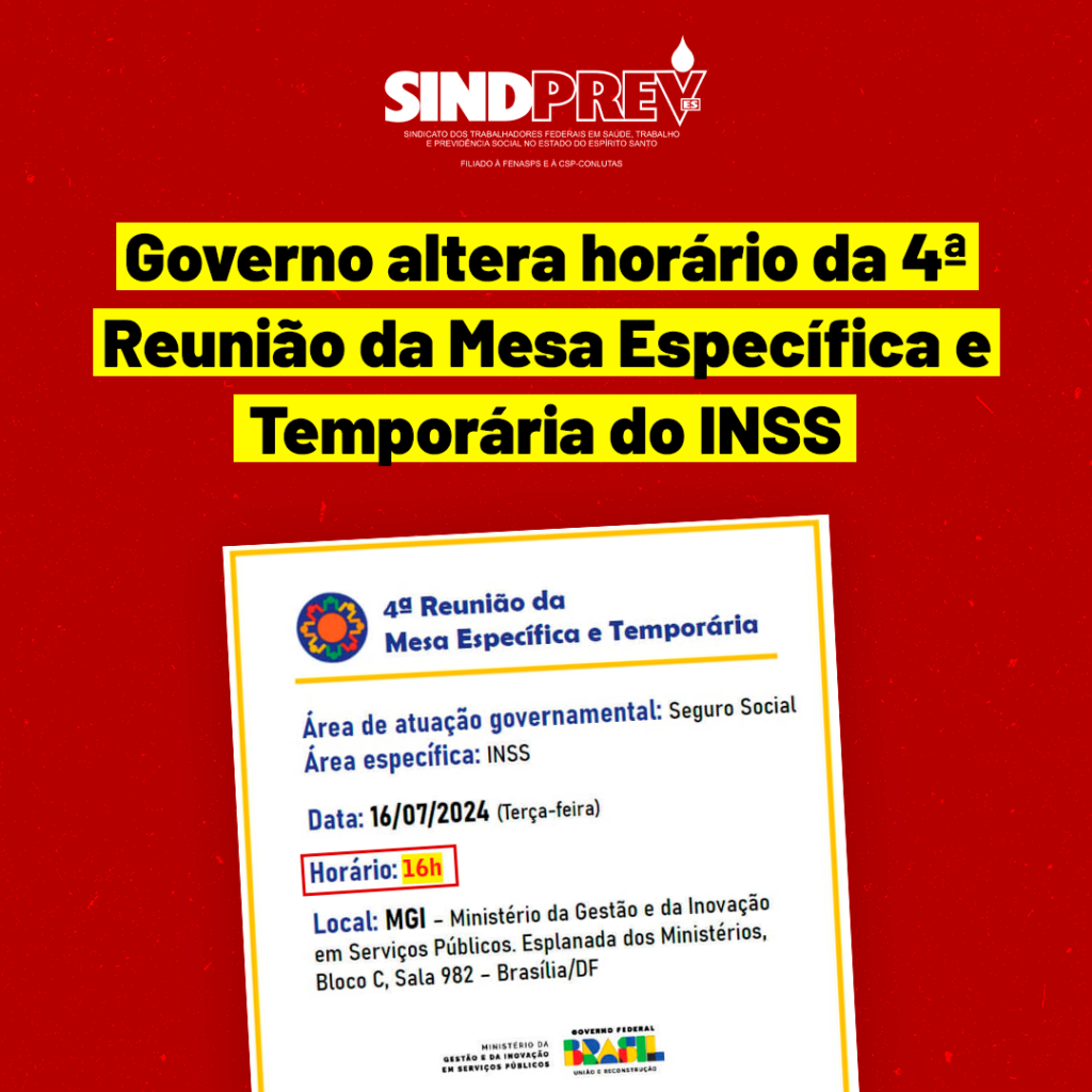 O governo alterou o horário da 4ª Reunião da Mesa Específica e Temporária do INSS, a ser realizada nesta terça-feira, 16 de julho.