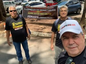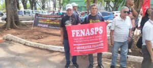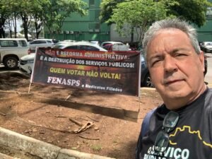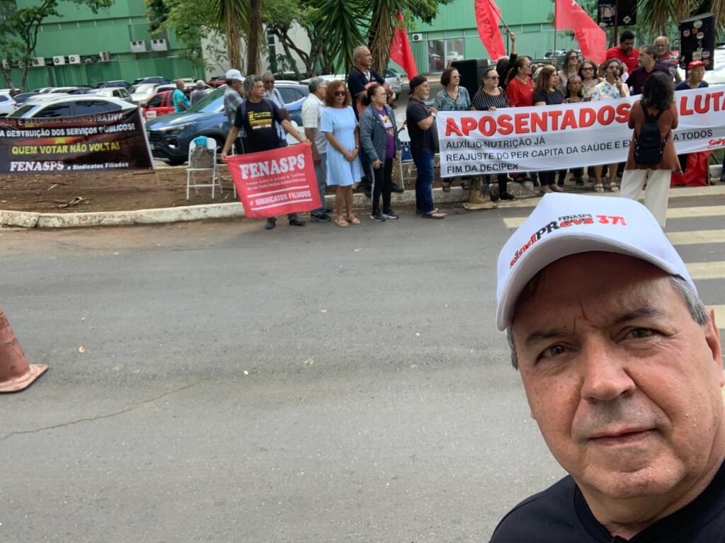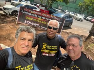 Após ato contra a reforma administrativa no congresso, os representantes da FENASPS em unidade com os servidores aposentados e os pensionistas de Brasília e outros Estados realizaram ato no Ministério da Gestão e da Inovação em Serviços Públicos (MGI), bloco C da Esplanada dos Ministérios, para cobrar:
